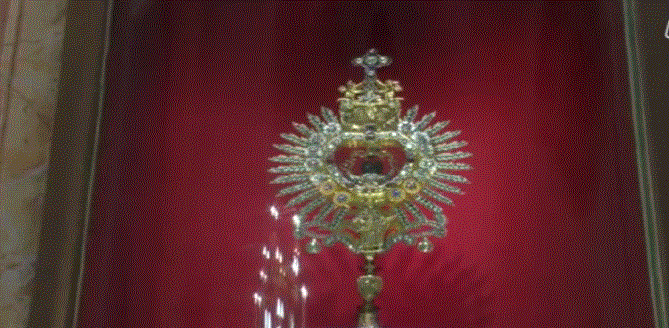 Euharistijsko čudo u Ludbregu: „Kad je htio popiti iz kaleža tekućinu posvećenu u Krv Kristovu, počeo je sumnjati nalazi li se u tom kaležu istinito tijelo i istinita Krv. Tada je uočio u kaležu pravu svježu Krv. Zaprepastio se i prestrašio pa je kalež s Krvlju brzo spremio iza oltara i završio misu. Kasnije je Krv stavio u staklenu posudu i naredio zidaru da zazida u zid kapele.“
