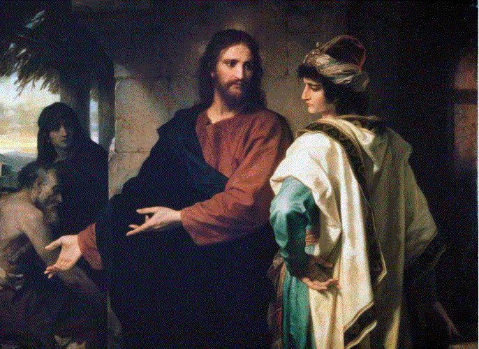 Neki je bogataš zaustavio Gospodina s jednim naoko iskrenim pitanjem. Zanimalo ga je što treba učiniti da baštini život vječni? Naš je Gospodin naveo zapovijedi koje se odnose na naše odnose prema bližnjima. Tih pet zapovijedi naime kažu: “Ljubi svoga bližnjega kao sama sebe.” Čovjek je tvrdio da ih drži od svoje mladosti. Ali, je li doista ljubio svoga bližnjeg kao samog sebe? Ako jest, neka to dokaže time što će prodati svu svoju imovinu i novac podati siromasima. Otišao je žalostan jer je imao velik imetak.