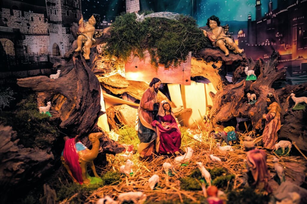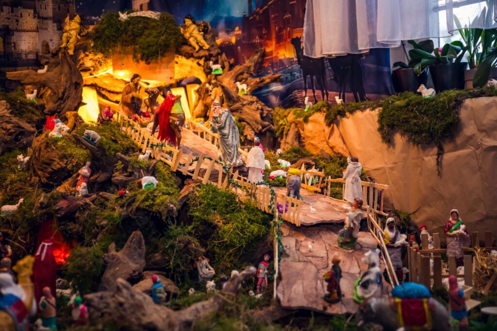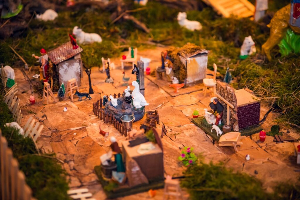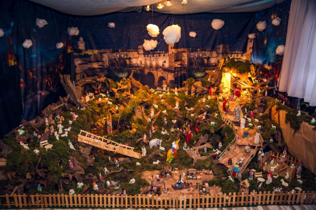 Scenografiju Isusova rođenja oblikuje 50-ak panjeva, kolica kamenja, 15 sanduka mahovine i voda koja cirkulira tvoreći dva mala slapa. U takvoj prirodi smjestilo se više od 150 ovčica i 100-tinjak pastira.