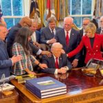 A crowd of people bowing their heads in prayer.